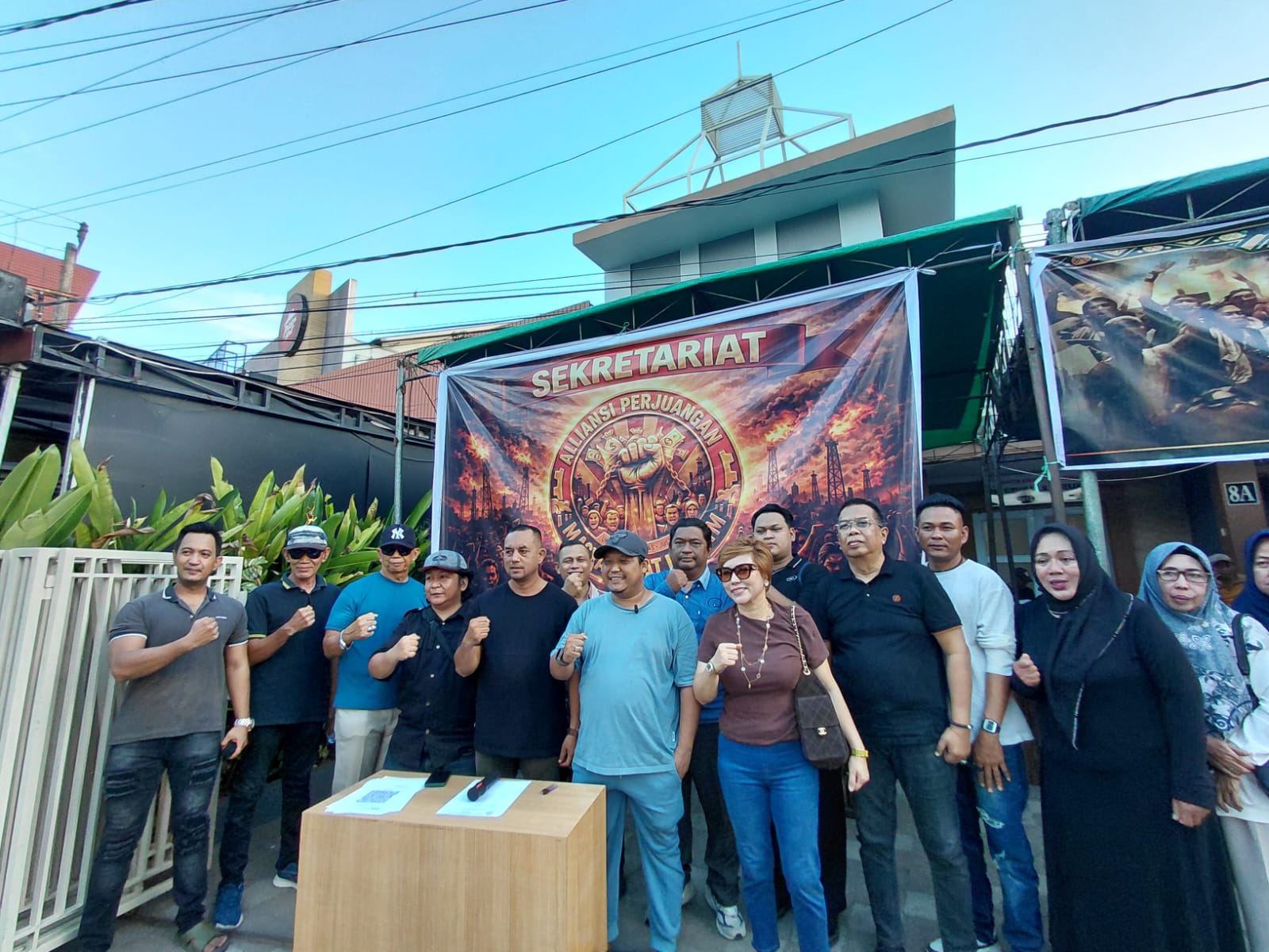 Sejumlah perwakilan Aliansi Perjuangan Masyarakat (APM) Kalimantan Timur berfoto bersama di depan Sekretariat APM Kaltim usai menyampaikan himbauan terkait pelaksanaan aksi damai 21 April 2026 di Samarinda. Para peserta menegaskan komitmen menjaga ketertiban, menolak provokasi, serta mengedepankan penyampaian aspirasi secara santun dan sesuai aturan hukum. (Foto: Fathur)