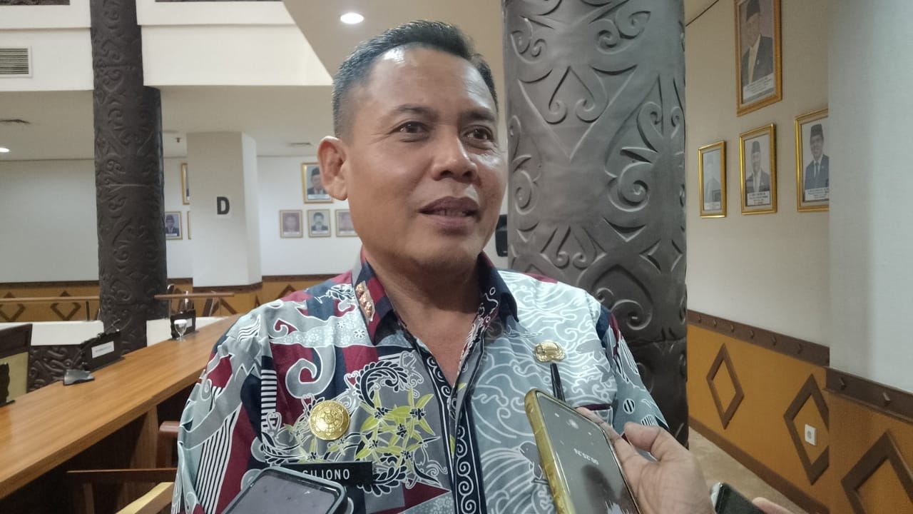 Camat Samarinda Ulu, Sujono, memberikan keterangan kepada wartawan usai mengikuti hearing bersama DPRD Kota Samarinda dan Dinas PUPR terkait penataan pedagang di kawasan Polder Air Hitam, di Gedung DPRD Kota Samarinda, Kamis (5/2/2026).(Foto: Fathur)