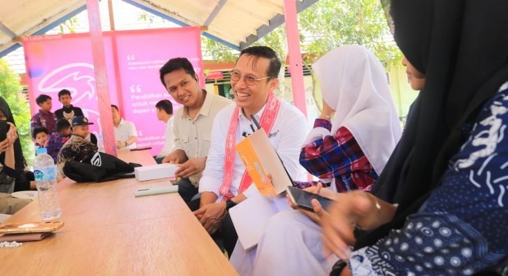 SVP Head of Region Kalimantan Indosat Ooredoo Hutchison, Sugiyanto (tengah), berbincang santai dengan guru dan siswa SMP Negeri 13 Lempake, Samarinda, saat peluncuran Program Desa Digital yang mengusung konsep Sekolah Digital.