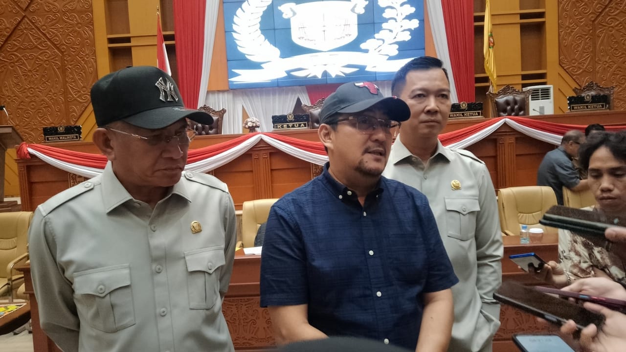 Iswandi didampingi H. Viktor Yuan, H. Joha Pajal, saat memberikan penjelasan kepada awak media terkait pengawalan penataan Pasar Pagi, usai pertemuan bersama pedagang di Gedung DPRD Kota Samarinda.