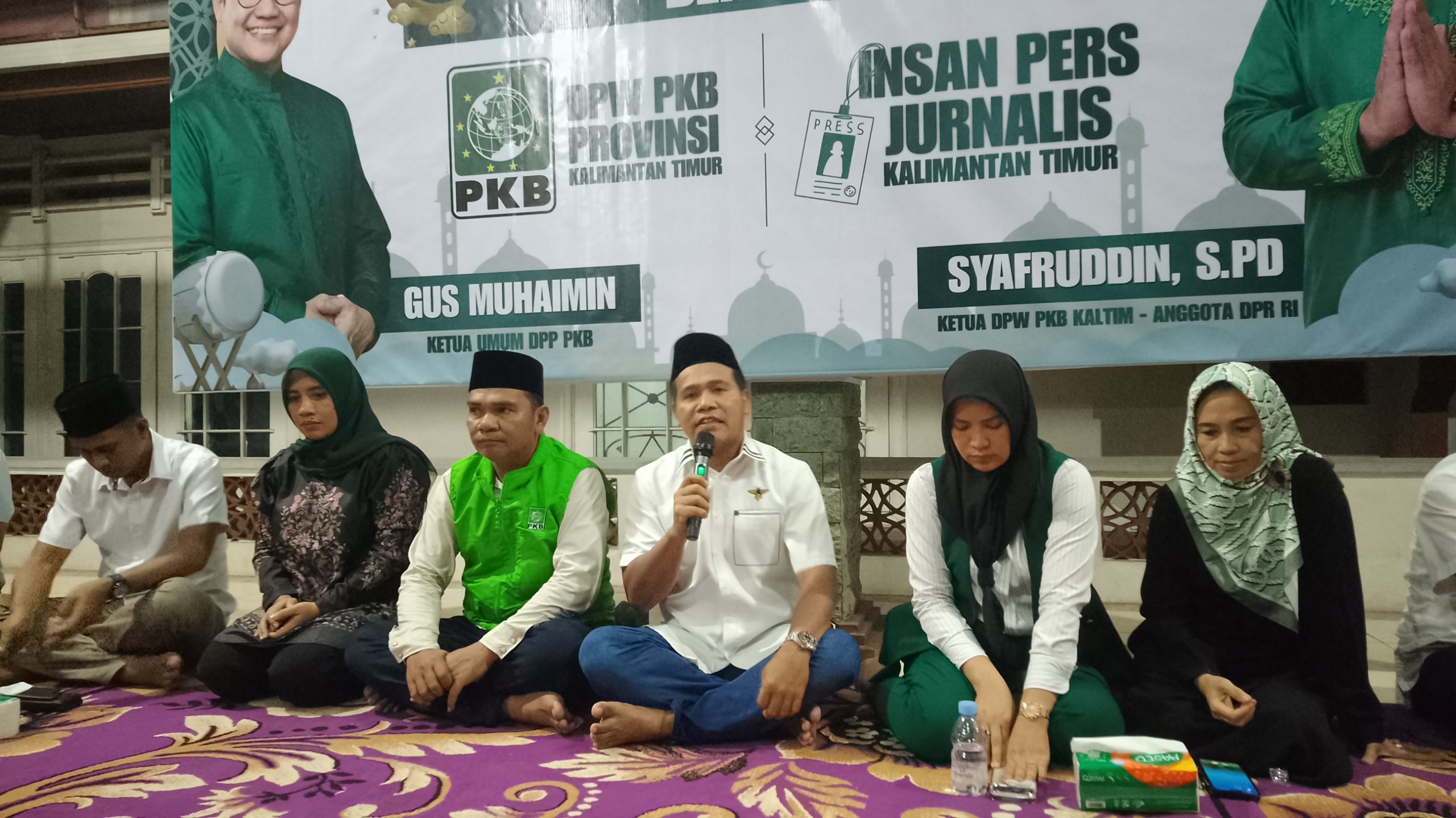 Ketua DPW PKB Kalimantan Timur, Syafruddin, menyampaikan pandangan politik partai dalam sesi dialog bersama insan pers di sela kegiatan buka puasa bersama, Samarinda. (Foto: Fathur)