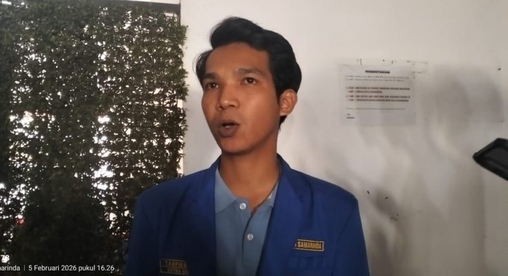 Taupik Udin dari PMII Samarinda menyampaikan keterangan kepada awak media usai sharing bersama DPRD Kota Samarinda terkait penataan pelaku UMKM di kawasan Polder Air Hitam, Kamis (5/2/2026). Foto: FathurÂ