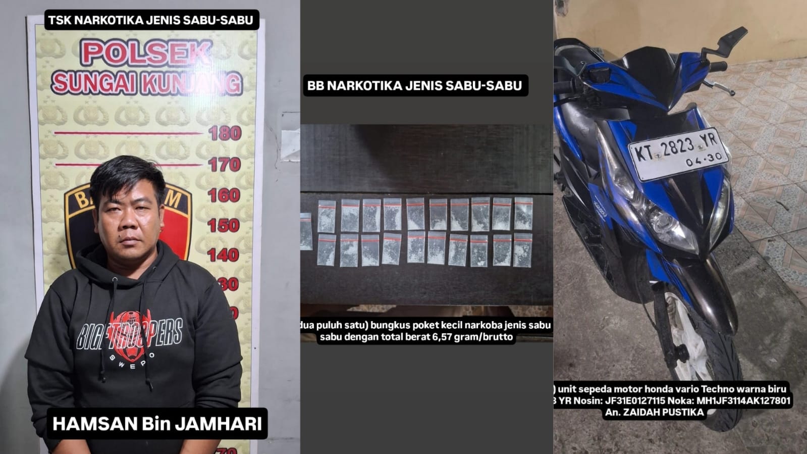 Mendapat informasi tersebut, petugas segera menuju lokasi dan mengamankan seorang pria yang mengaku bernama Hamsan. Saat dilakukan pemeriksaan, petugas menemukan satu amplop berisi 21 bungkus kecil atau poket sabu-sabu dengan berat total sekitar 6,57 gram bruto. Selain itu, turut diamankan uang tunai sebesar Rp1.250.000 yang diduga hasil penjualan sabu.