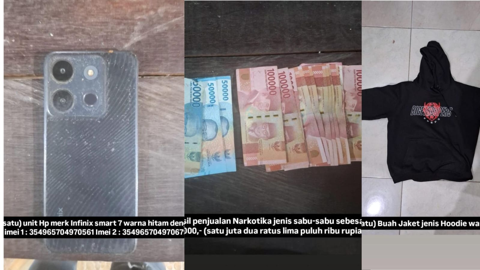 Adapun barang bukti lain yang disita petugas meliputi satu unit sepeda motor Honda Vario Techno warna biru KT 2823 YR, satu unit handphone Infinix Smart 7 warna hitam, serta satu jaket hoodie warna hitam.