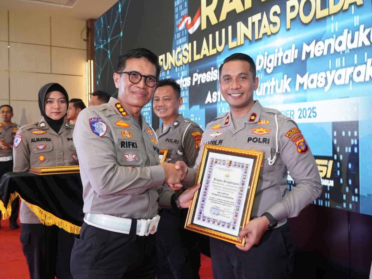 Kasat Lantas Polresta Samarinda Kompol La Ode Prasetyo menerima penghargaan dari Dirlantas Polda Kaltim dalam Rakernis dan Rakor Bid Regident 2025 di Balikpapan. (Foto: Humas Polresta Samarinda)