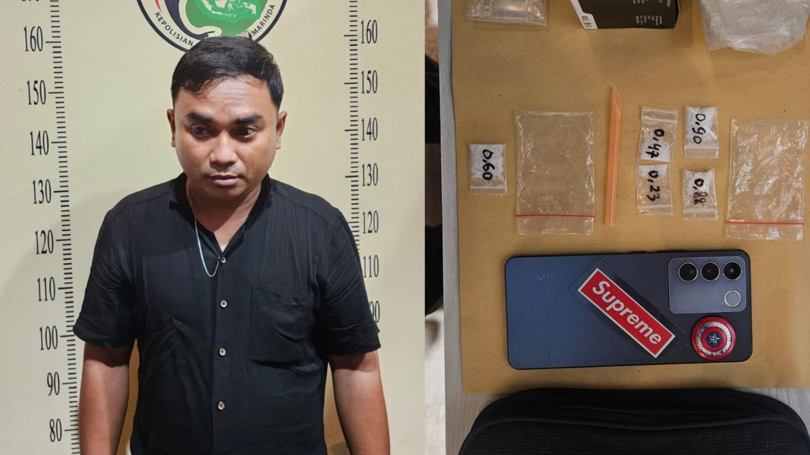Saat dilakukan penggerebekan di depan rumah tersangka, petugas menemukan empat poket sabu dengan berat bruto 2,48 gram yang disimpan dalam kotak lampu dan dibungkus plastik kresek. Selain itu, dari dalam kamar tersangka turut diamankan satu poket sabu seberat 0,60 gram yang tersimpan dalam tas hitam.