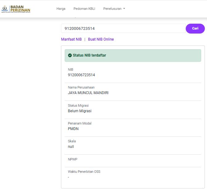 “ Setelah kita cek NIBnya di badan perijinan https://www.badanperizinan.co.id/nib.html dan www.oss.go.id status belum migrasi artinya data lama belum di migrasi ke system oss, NPWP tidak ada, dan Waktu Penerbitan OSS sudah tidak berlaku lagi artinya NIB saat ini tidak terbit atau tidak berlaku sudah mati atau data tidak lengkap sehingga NIB tidak terbit lagi. “ Kata Suryadinata.
