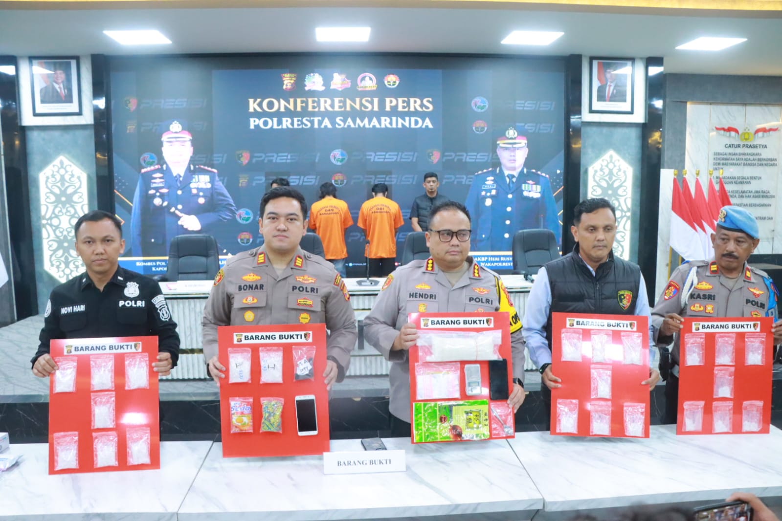 Kapolresta Samarinda Kombes Pol Hendri Umar (tengah) bersama jajaran memperlihatkan barang bukti narkotika jenis sabu seberat lebih dari 1 kilogram…