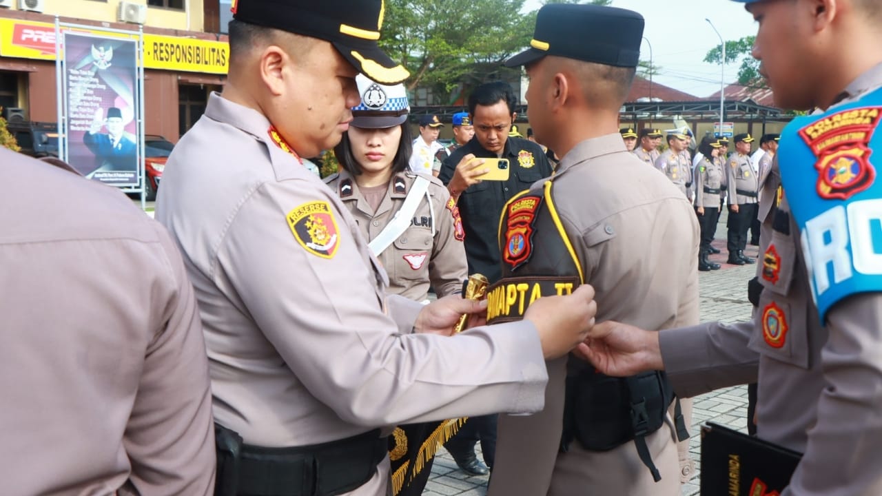 Kapolresta Samarinda Kombes Pol. Hendri Umar, S.I.K., M.H. menyematkan ban lengan Pamapta kepada perwakilan personel sebagai tanda resmi peluncuran Pasukan…